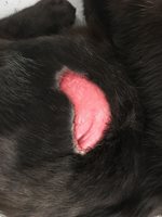 Puma is naar huis gegaan, maar onderhuids is onder de kleine wondjes toch een infectie ontstaan. Dit resulteerde uiteindelijk dat de huid afstierf en er een plek in de flank ontstond waar we de gehele dode huid hebben moeten verwijderen. Dit ziet er altijd heel heftig uit, maar uit ervaring weten wij dat katten meesters zijn in het herstellen van dit soort grote huid-defecten.
